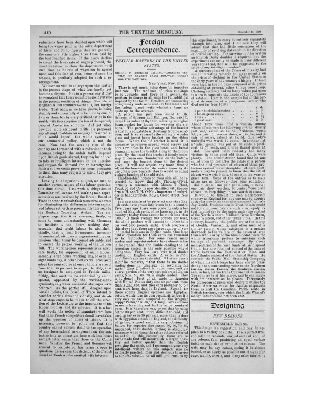 Patents, ---. Textile Mercury , Vol. 2 (1890), 2 pages. Note: Digital photography. Posted July 8, 2006. SAMPLE PAGE. File size 892 KB PDF