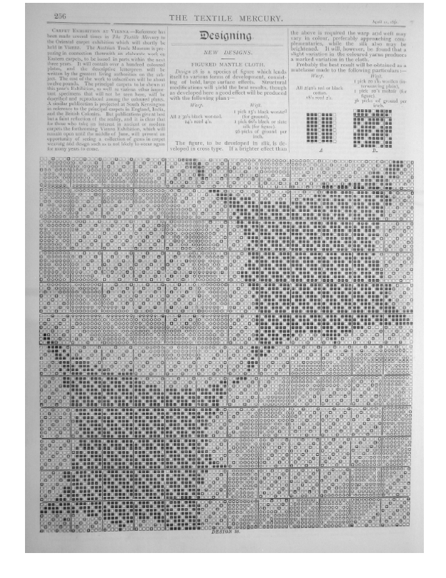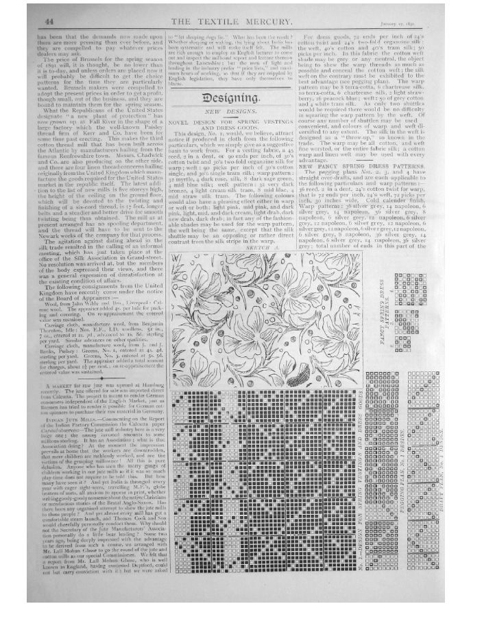 Designing, ---. Textile Mercury , Vol. 4 (1891), 2 pages. Note: Digital photography. Posted August 1, 2006. SAMPLE PAGE. File size 3.94 MB PDF