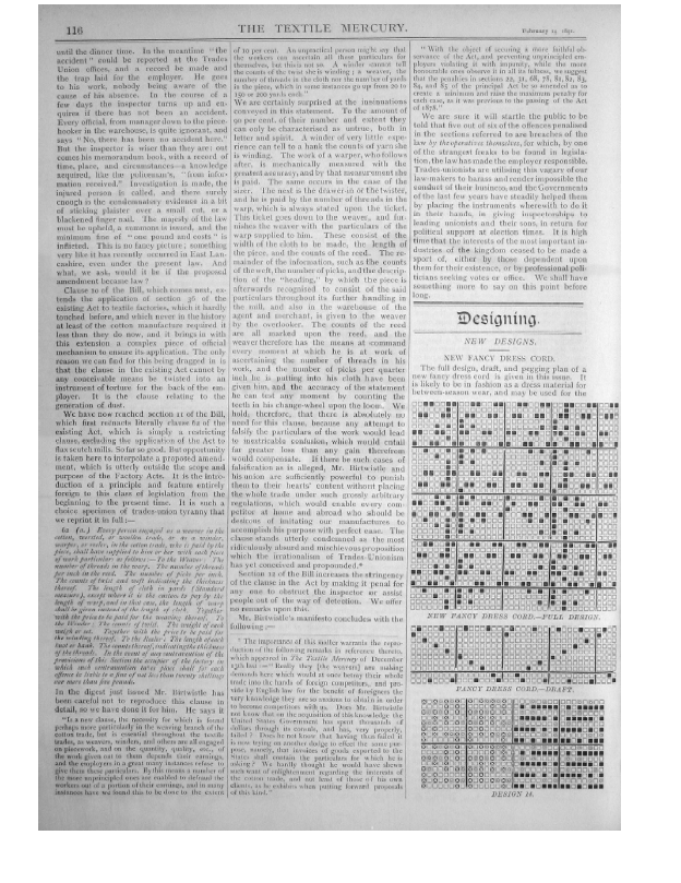 Designing, ---. Textile Mercury, October 11, 1890, 2 pages. Note: Digital photography. Posted September 10, 2006. SAMPLE PAGE. File size 1.46 MB PDF