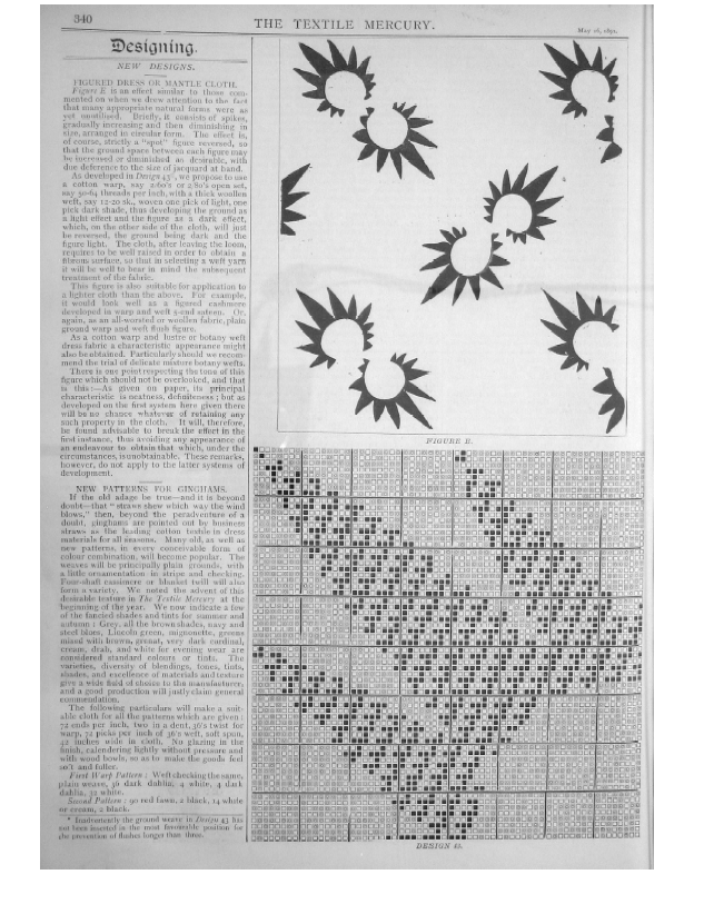 Designing, ---. Textile Mercury , Vol. 6 (1892), 2 pages. Note: Digital photography. Posted August 22, 2006. SAMPLE PAGE. File size 4.43 MB PDF