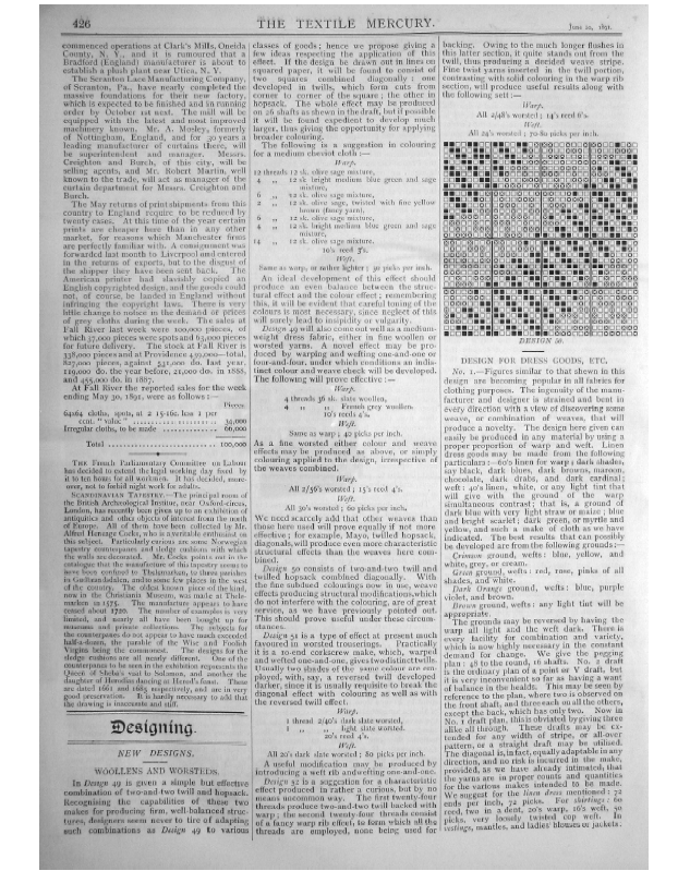 Designing, ---. Textile Mercury , Vol. 4 (1891), 2 pages. Note: Digital photography. Posted August 1, 2006. SAMPLE PAGE. File size 4.14 MB PDF
