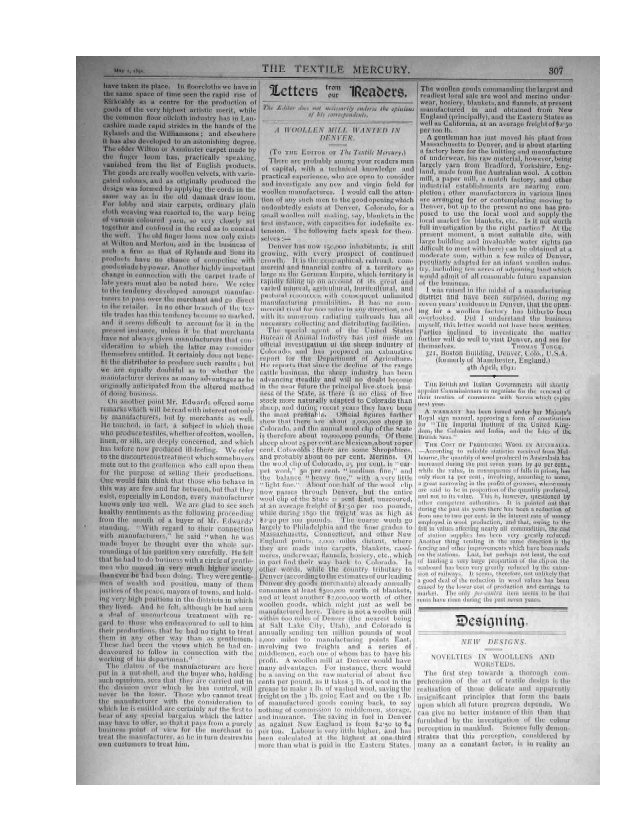 Patents, ---. Textile Mercury , Vol. 4 (1891), 2 pages. Note: Digital photography. Posted August 1, 2006. SAMPLE PAGE. File size 3.99 MB PDF