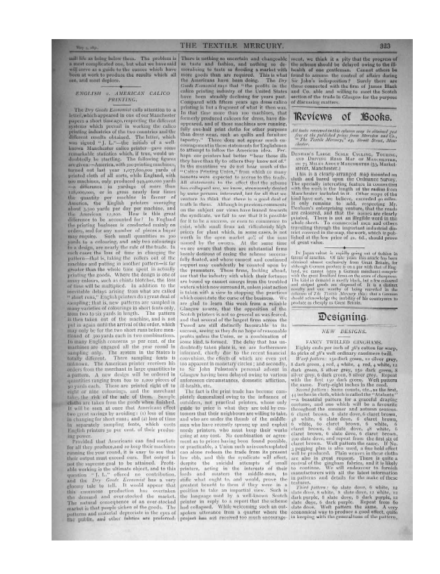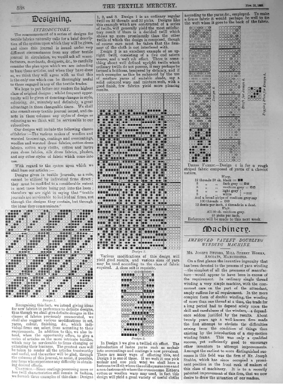 Designing, ---. Textile Mercury , Vol. 2 (1890), 2 pages. Note: Digital photography. Posted July 10, 2006. SAMPLE PAGE. File size 685 KB PDF