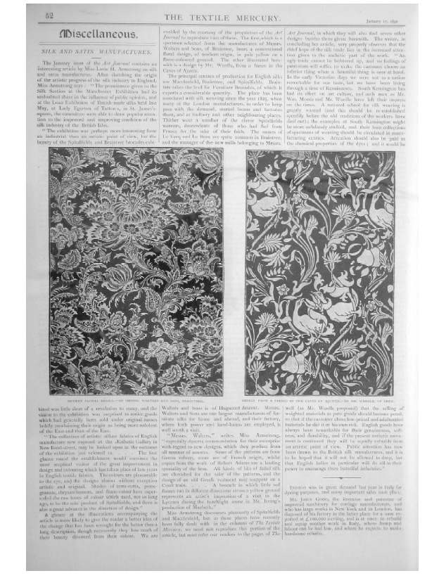Silk and Satin Manufactures, ---. Textile Mercury , Vol. 4 (1891), 1 page. Note: Digital photography. Posted August 1, 2006. SAMPLE PAGE. File size 2.29 MB PDF