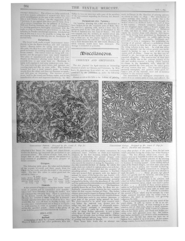 Chintzes and Cretonnes, ---. Textile Mercury , Vol. 4 (1891), 2 pages. Note: Digital photography. Posted August 1, 2006. SAMPLE PAGE. File size 4.68 MB PDF