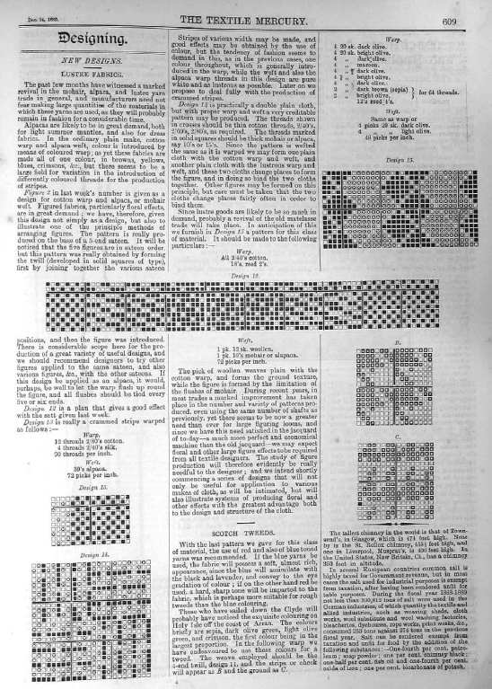 Designing, ---. Textile Mercury , Vol. 6 (1892), 2 pages. Note: Digital photography. Posted August 22, 2006. SAMPLE PAGE. File size 4.56 MB PDF