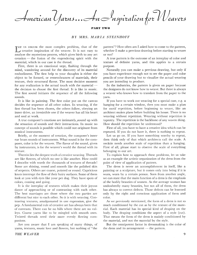 American Yarns… An Inspiration for Weavers, Part Two, Steinhoff, Mrs. Maria. Weaver, Vol. 1 No. 1 (January 1936), 7 pages. Note: PDF provided by Judith Combs. Posted September 2, 2006. SAMPLE PAGE. File size 1.1 MB PDF