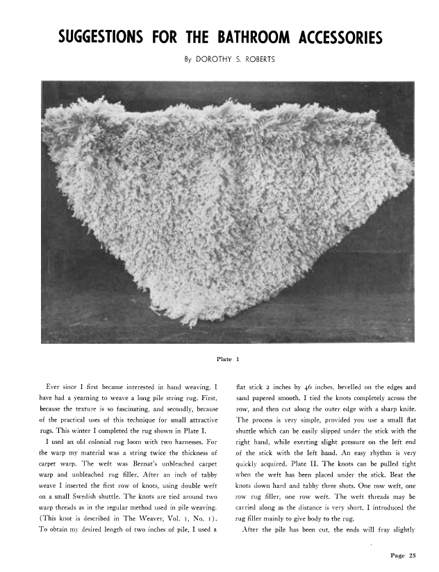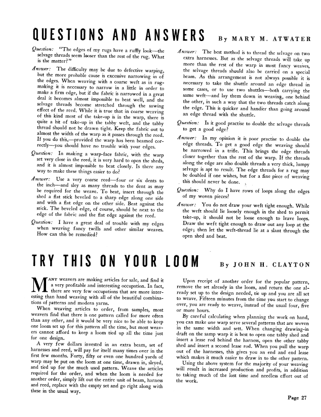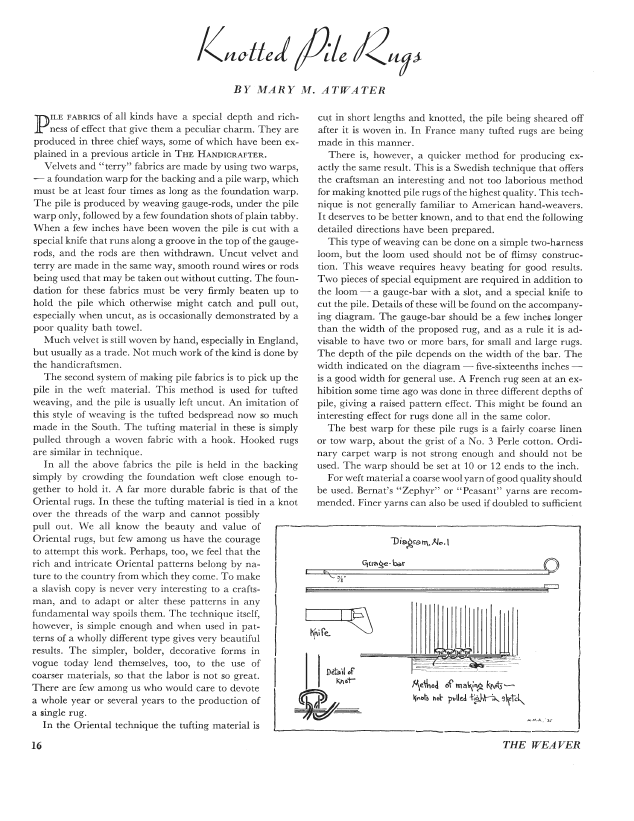 Knotted Pile Rugs, Atwater, Mary M. Weaver, Vol. 1 No. 1 (January 1936), 3 pages. Note: PDF provided by Judith Combs. Posted September 2, 2006. SAMPLE PAGE. File size 349 KB PDF