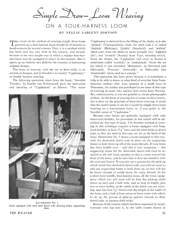 Simple Draw-Loom Weaving, Johnson, Nellie Sargent. Weaver, Vol. 1 No. 1 (January 1936), 4 pages. Note: PDF provided by Judith Combs. Posted September 2, 2006. SAMPLE PAGE. File size 518 KB PDF