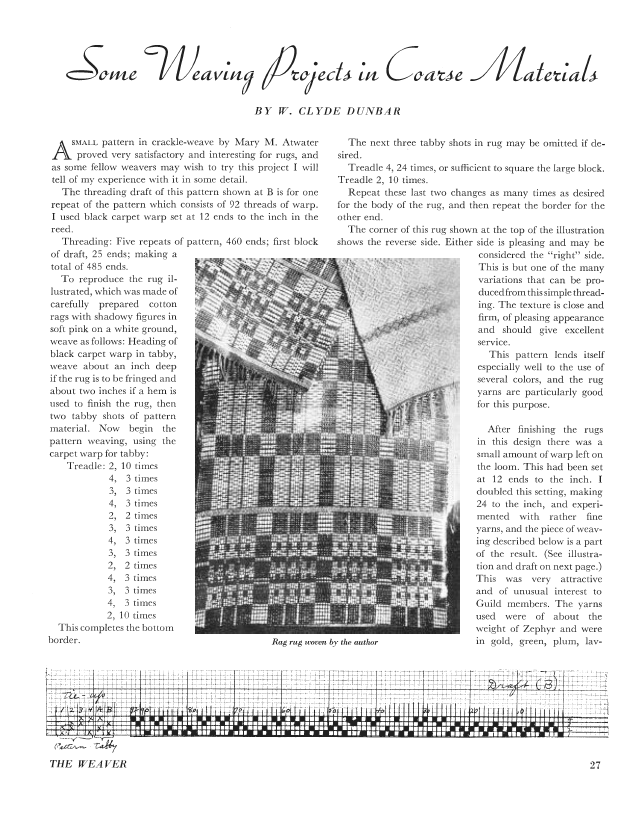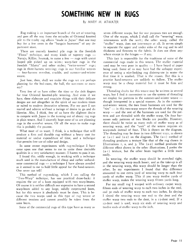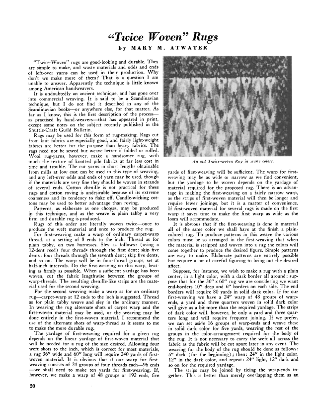 Twice Woven Rugs, Atwater, Mary M. Weaver, Vol. 3 No. 4 (October 1938), 2 pages. Note: PDF provided by Judith Combs. Posted September 2, 2006. SAMPLE PAGE. File size 276 KB PDF