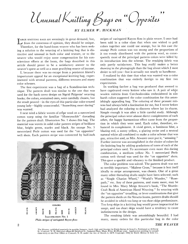 Unusual Knitting Bags on Opposites, Hickman, Elmer Wallace. Weaver, Vol. 1 No. 2 (March 1936), 4 pages. Note: PDF provided by Judith Combs. Posted September 2, 2006. SAMPLE PAGE. File size 513 KB PDF
