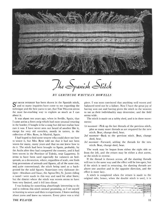 The Spanish Stitch, Howells, Gertrude Whitman. Weaver, Vol. 1 No. 2 (March 1936), 4 pages. Note: PDF provided by Judith Combs. Posted September 2, 2006. SAMPLE PAGE. File size 335 KB PDF