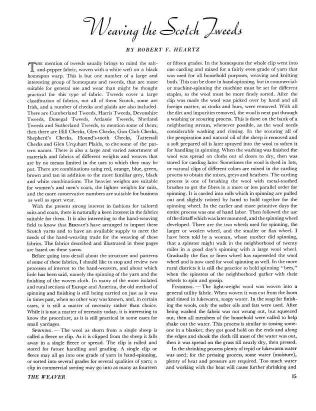 Weaving the Scotch Tweeds, Heartz, Robert F. Weaver, Vol. 1 No. 2 (March 1936), 7 pages. Note: PDF provided by Judith Combs. Posted September 2, 2006. SAMPLE PAGE. File size 871 KB PDF