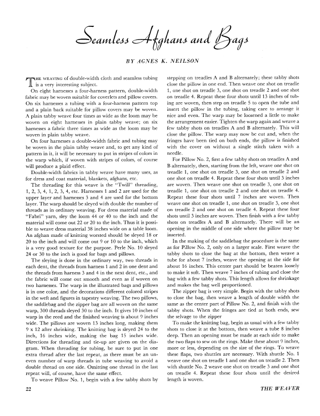 Seamless Afghans and Bags, Neilson, Agnes K. Weaver, Vol. 1 No. 2 (March 1936), 4 pages. Note: PDF provided by Judith Combs. Posted September 2, 2006. SAMPLE PAGE. File size 311 KB PDF