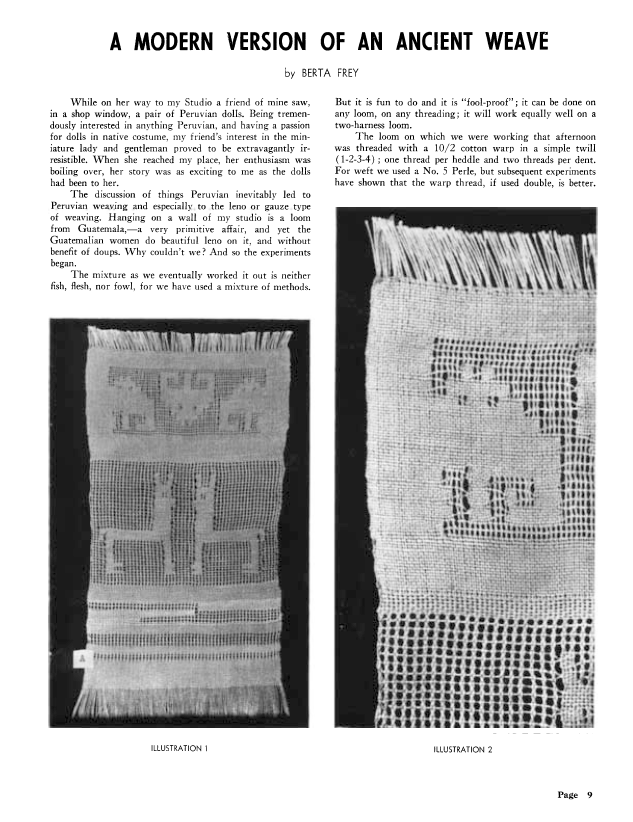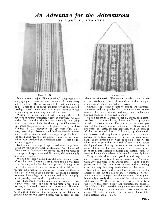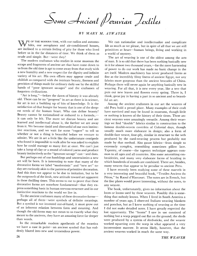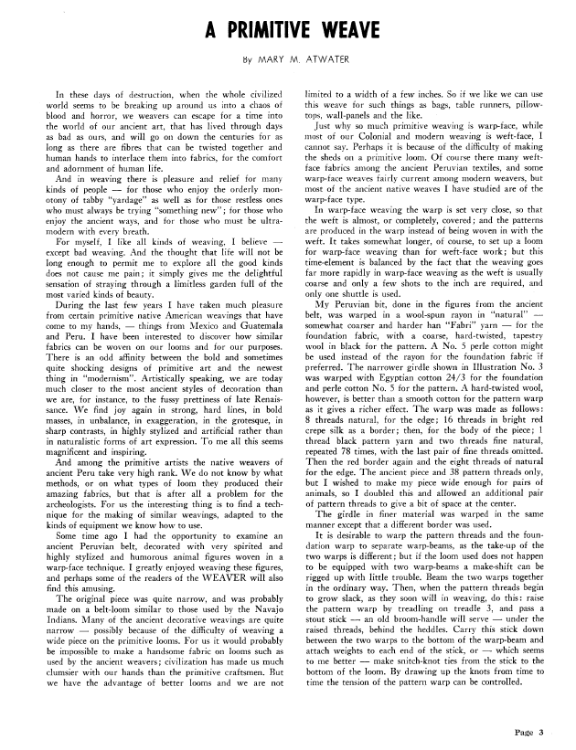 Some Ancient Peruvian Textiles, Atwater, Mary M. Weaver, Vol. 1 No. 2 (March 1936), 6 pages. Note: PDF provided by Judith Combs. Posted September 2, 2006. SAMPLE PAGE. File size 493 KB PDF