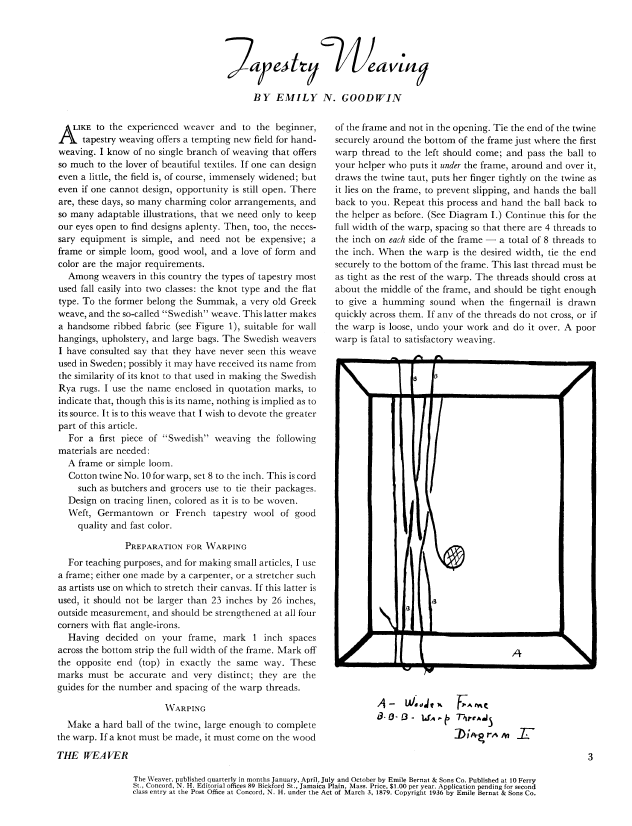 Tapestry Weaving, Goodwin, Emily. Weaver, Vol. 1 No. 3 (July 1936), 4 pages. Note: PDF provided by Judith Combs. Posted September 2, 2006. SAMPLE PAGE. File size 434 KB PDF