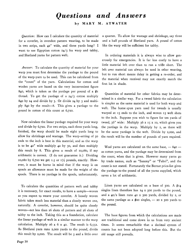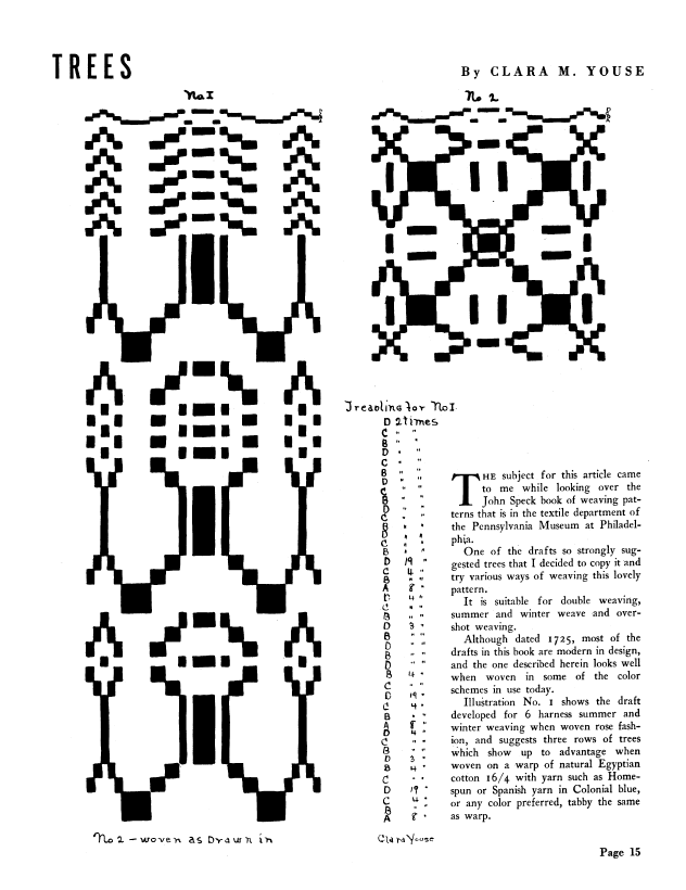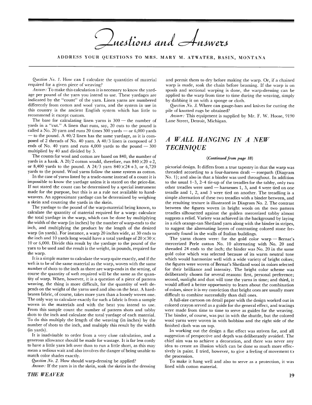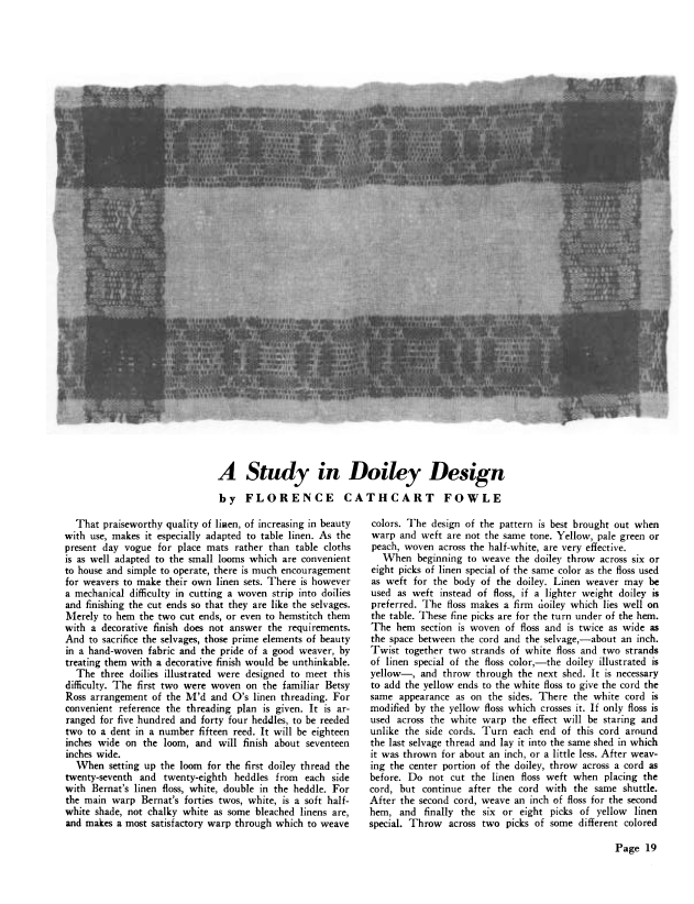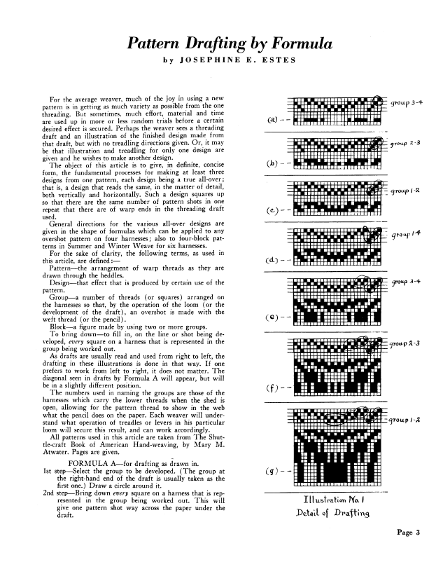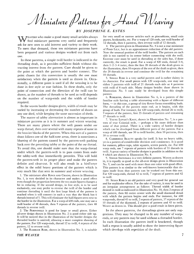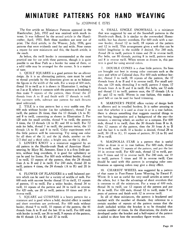 Forethought in Figuring, Gallinger, Osma Couch. Weaver, Vol. 5 No. 1 (January-February 1940), 4 pages. Note: PDF provided by Judith Combs. Posted September 2, 2006. SAMPLE PAGE. File size 411 KB PDF