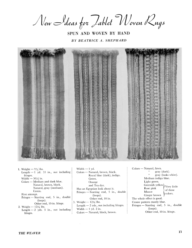 New Ideas for Tablet Woven Rugs, Spun and Woven by Hand, Shephard, Beatrice. Weaver, Vol. 1 No. 3 (July 1936), 1 page. Note: PDF provided by Judith Combs. Posted September 2, 2006. SAMPLE PAGE. File size 68 KB PDF