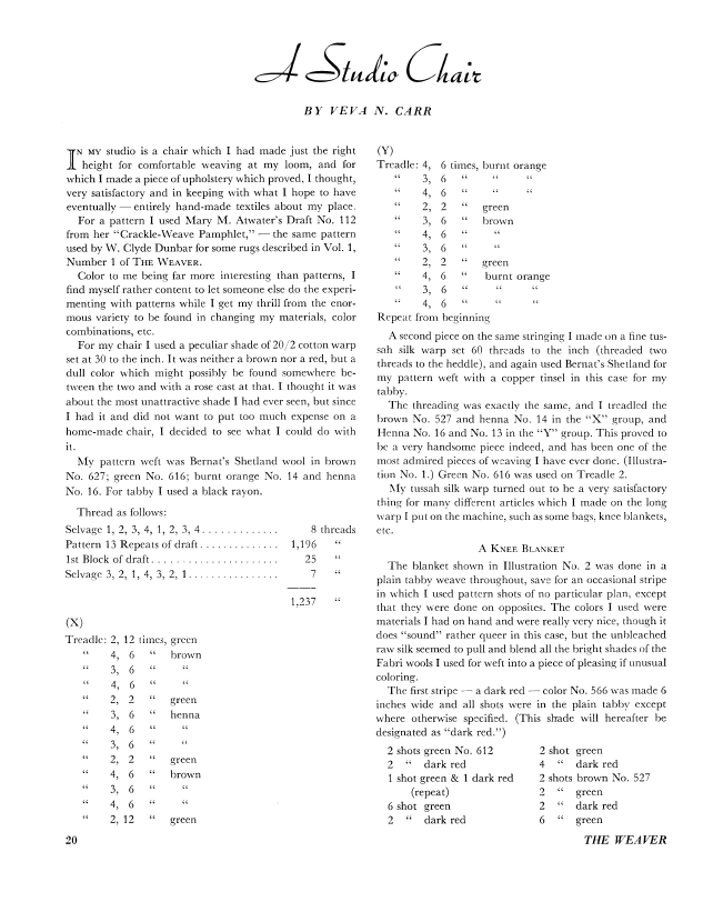 A Studio Chair, Carr, Veva N. Weaver, Vol. 1 No. 3 (July 1936), 3 pages. Note: PDF provided by Judith Combs. Posted September 2, 2006. SAMPLE PAGE. File size 240 KB PDF