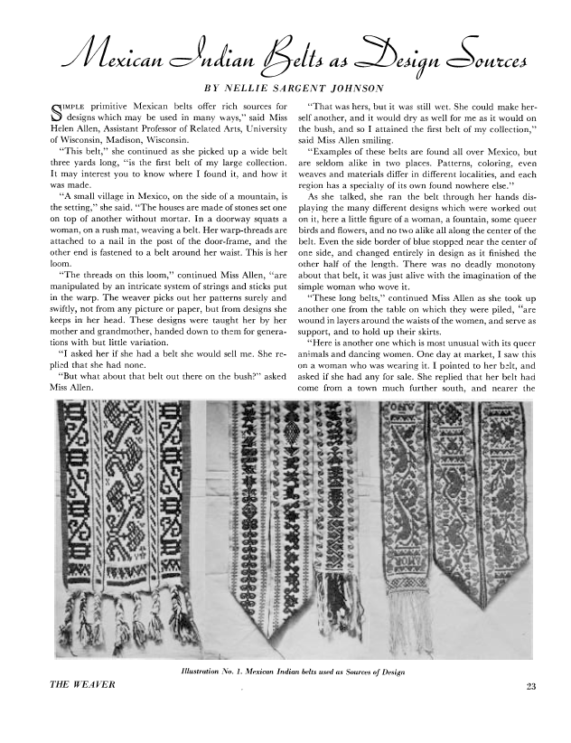 Mexican Indian Belts as Design Sources, Johnson, Nellie Sargent. Weaver, Vol. 1 No. 3 (July 1936), 2 pages. Note: PDF provided by Judith Combs. Posted September 2, 2006. SAMPLE PAGE. File size 253 KB PDF