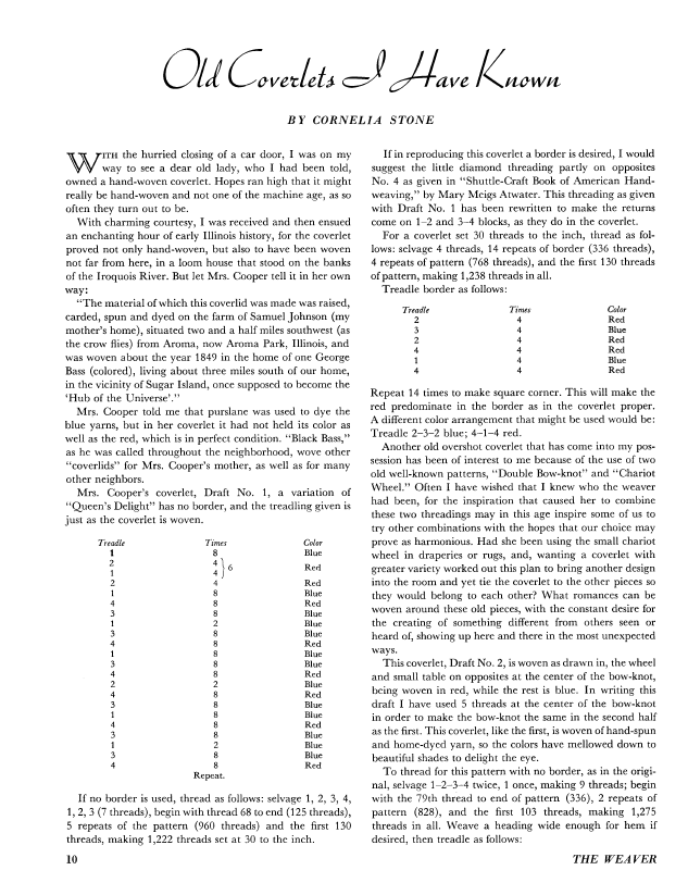 Old Coverlets I Have Known, Stone, Cornelia. Weaver, Vol. 1 No. 4 (October 1936), 5 pages. Note: PDF provided by Judith Combs. Posted September 2, 2006. SAMPLE PAGE. File size 564 KB PDF