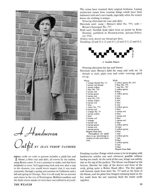A Handwoven Outfit, Pasmore, Jean Perow. Weaver, Vol. 1 No. 4 (October 1936), 1 page. Note: PDF provided by Judith Combs. Posted September 2, 2006. SAMPLE PAGE. File size 84 KB PDF