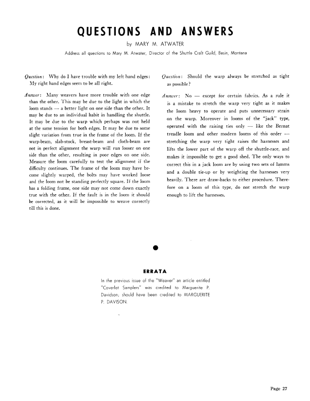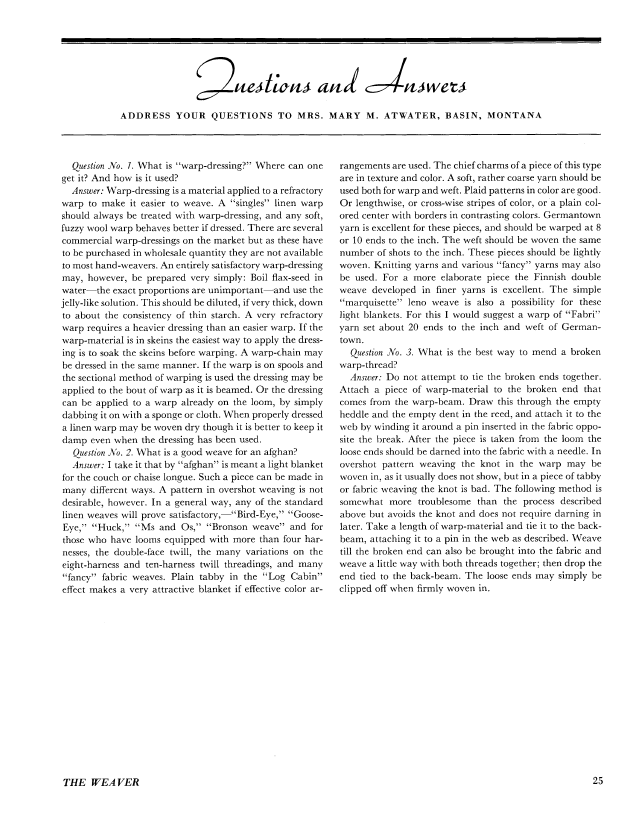 Questions and Answers, Atwater, Mary M. Weaver, Vol. 7 No. 2 (July 1942), 1 page. Note: PDF provided by Judith Combs. Posted September 2, 2006. SAMPLE PAGE. File size 106 KB PDF