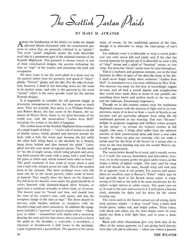 The Scottish Tartan Plaids, Atwater, Mary M. Weaver, Vol. 1 No. 4 (October 1936), 5 pages. Note: PDF provided by Judith Combs. Posted September 2, 2006. SAMPLE PAGE. File size 424 KB PDF