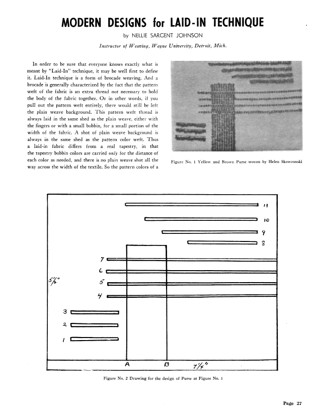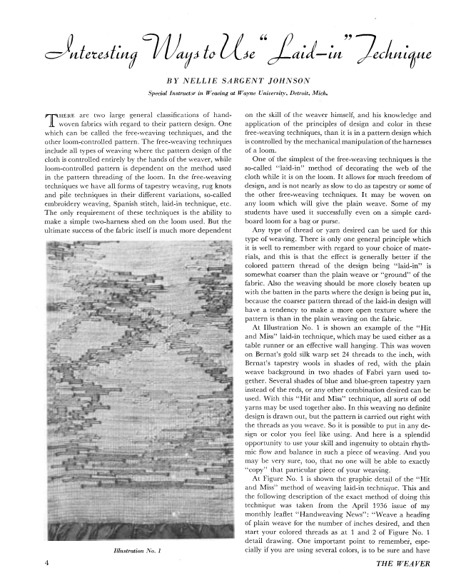 Interesting Ways to Use Laid-in Technique, Johnson, Nellie Sargent. Weaver, Vol. 2 No. 1 (January 1937), 4 pages. Note: PDF provided by Judith Combs. Posted September 2, 2006. SAMPLE PAGE. File size 519 KB PDF