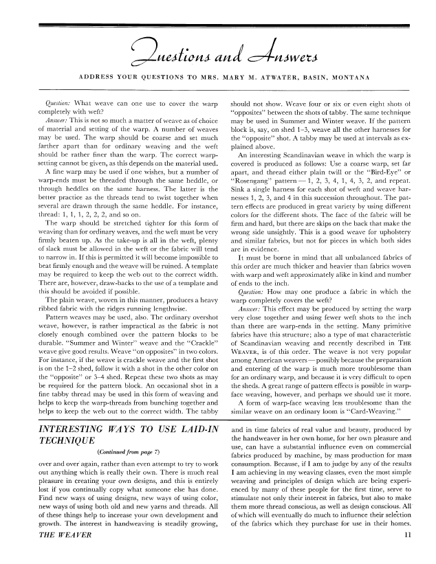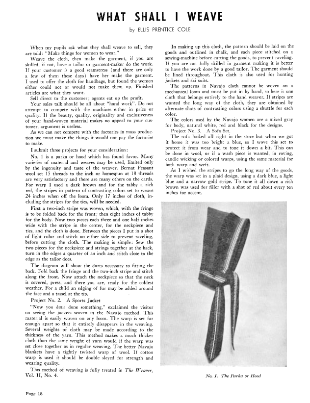 What Shall I Weave, Cole, Ellis Prentice. Weaver, Vol. 5 No. 4 (October-November 1940), 2 pages. Note: PDF provided by Judith Combs. Posted September 2, 2006. SAMPLE PAGE. File size 164 KB PDF