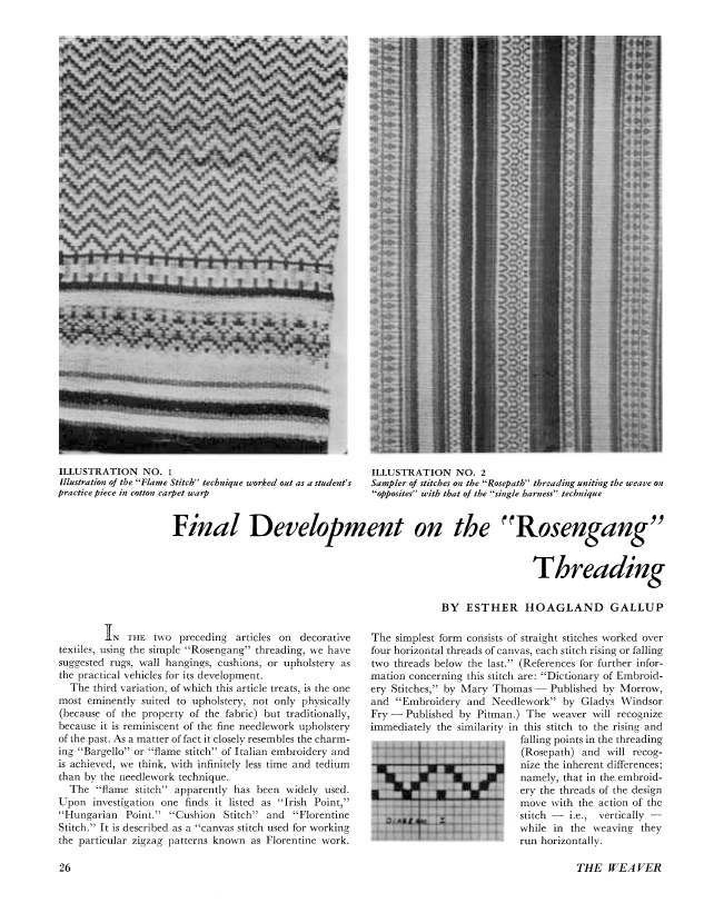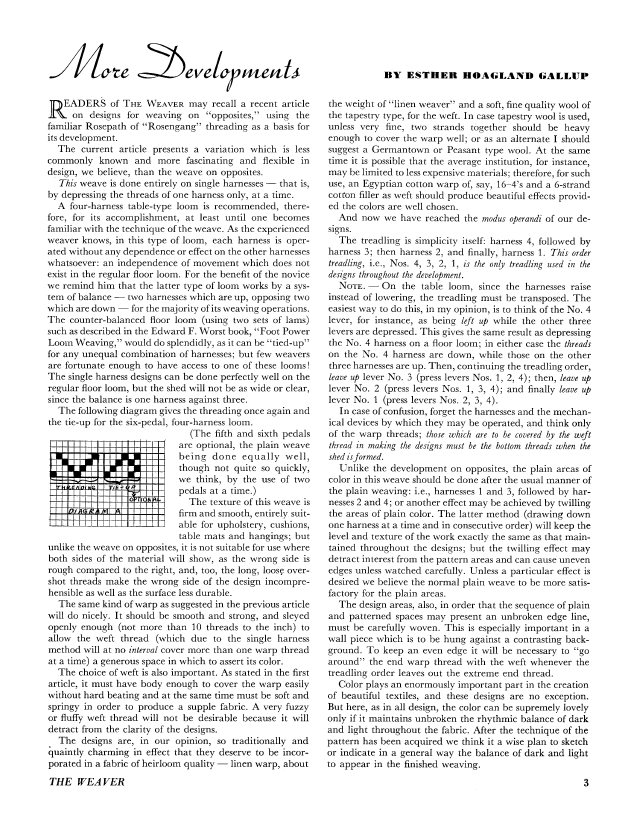 Final Development on the Rosengang Threading, Gallup, Esther Hoagland. Weaver, Vol. 2 No. 4 (October 1937), 2 pages. Note: PDF provided by Judith Combs. Posted September 2, 2006. SAMPLE PAGE. File size 222 KB PDF