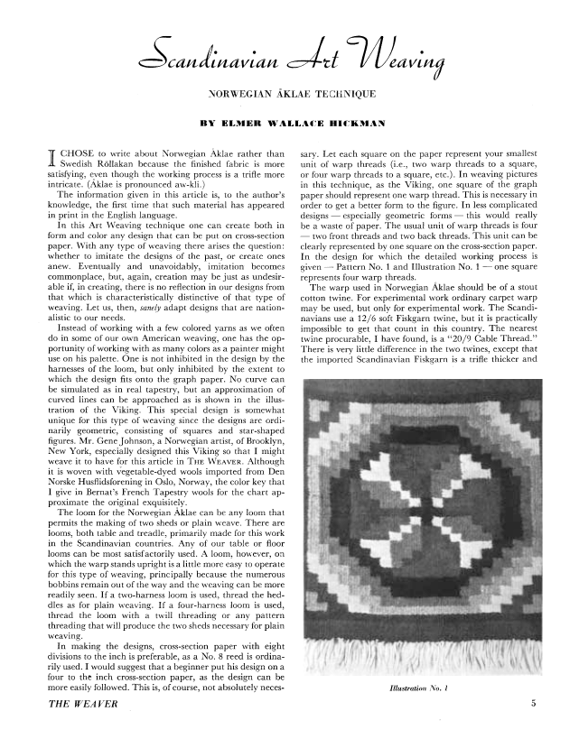 Scandinavian Art Weaving, Norwegian Aklae Technique, Hickman, Elmer Wallace. Weaver, Vol. 2 No. 2 (April 1937), 11 pages. Note: PDF provided by Judith Combs. Posted September 2, 2006. SAMPLE PAGE. File size 1.5 MB PDF