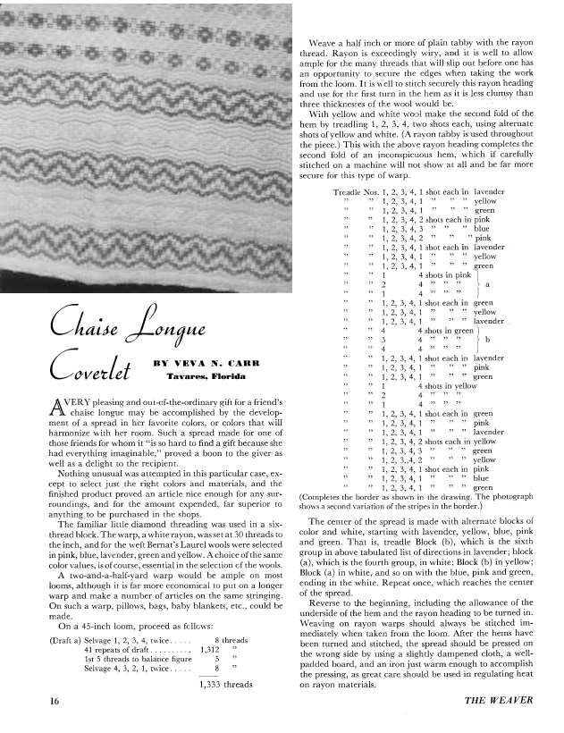 Chaise Longue Coverlet, Carr, Veva N. Weaver, Vol. 2 No. 2 (April 1937), 2 pages. Note: PDF provided by Judith Combs. Posted September 2, 2006. SAMPLE PAGE. File size 404 KB PDF