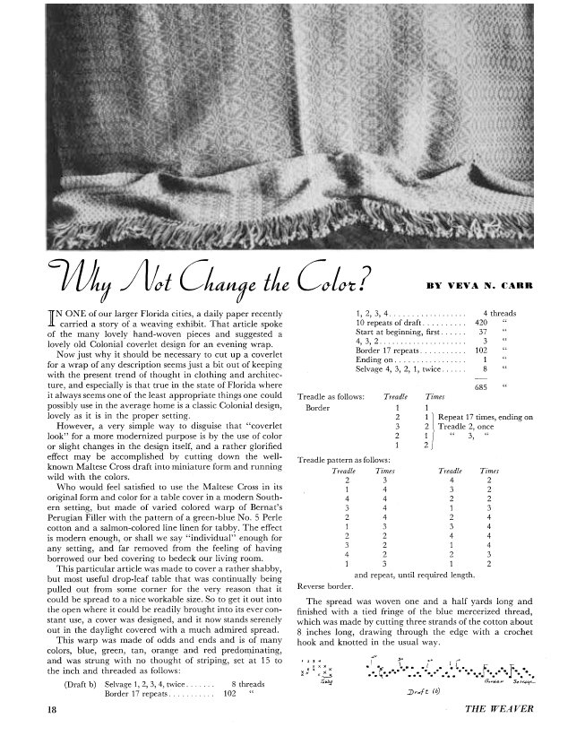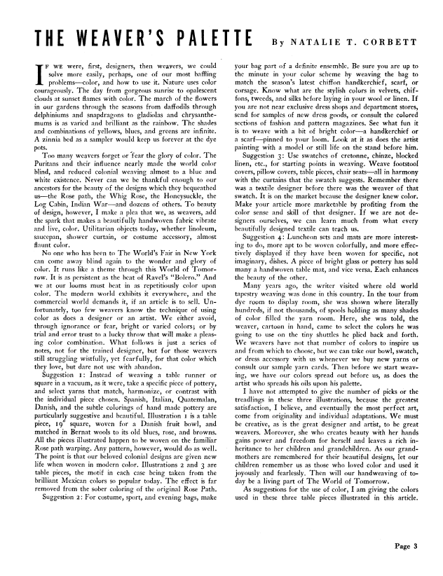 The Weaver's Palette, Corbett, Natalie. Weaver, Vol. 4 No. 3 (July 1939), 4 pages. Note: PDF provided by Judith Combs. Posted September 2, 2006. SAMPLE PAGE. File size 290 KB PDF