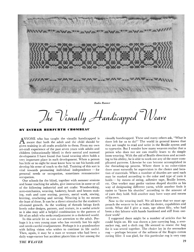 The Visually Handicapped Weave, Chombeau, Esther Herfurth. Weaver, Vol. 2 No. 2 (April 1937), 4 pages. Note: PDF provided by Judith Combs. Posted September 2, 2006. SAMPLE PAGE. File size 393 KB PDF