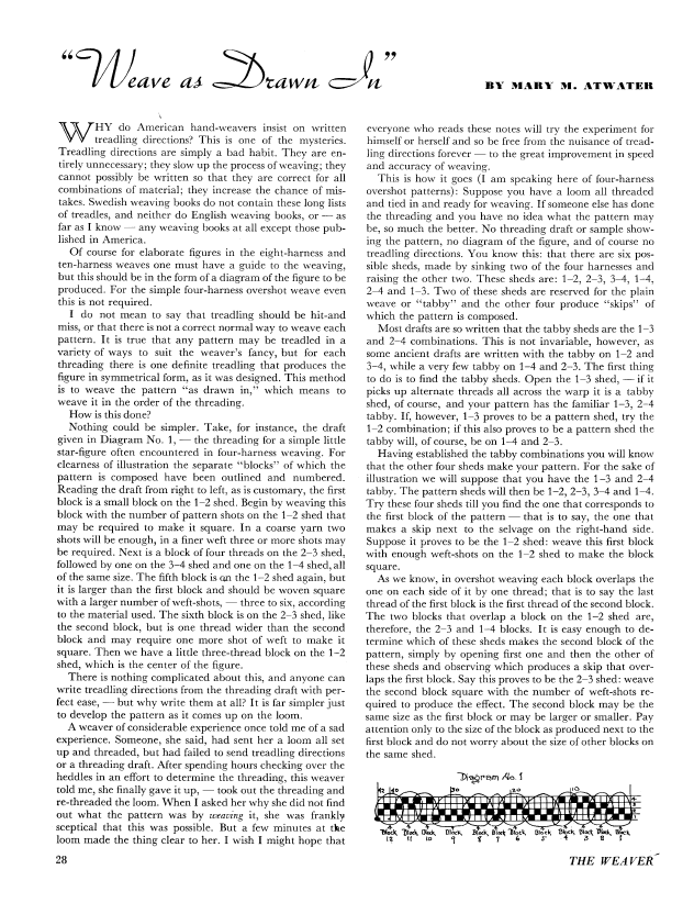 Weave as Drawn In, Atwater, Mary M. Weaver, Vol. 2 No. 2 (April 1937), 4 pages. Note: PDF provided by Judith Combs. Posted September 2, 2006. SAMPLE PAGE. File size 547 KB PDF