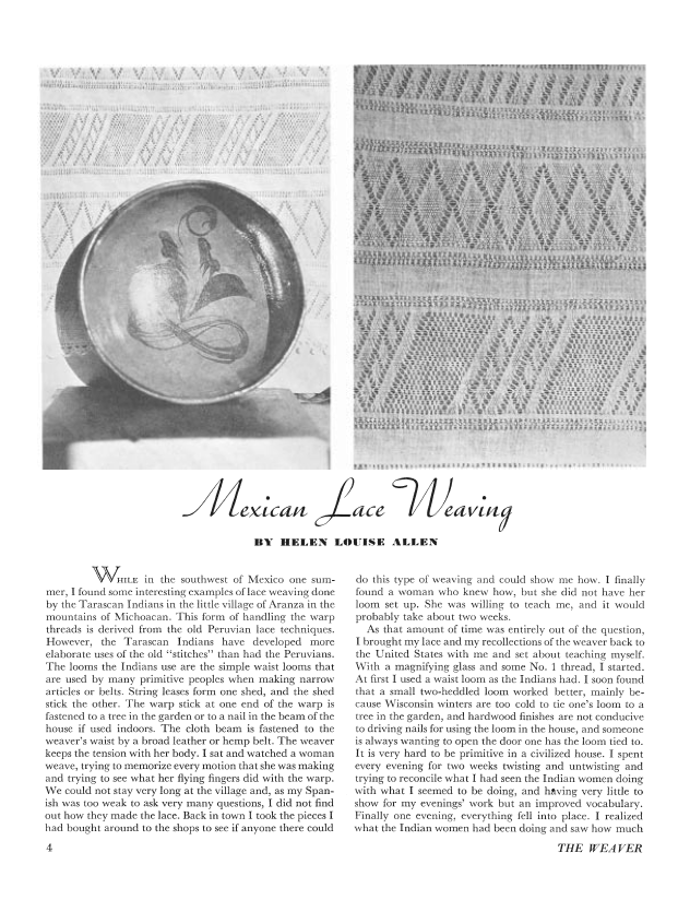 Mexican Lace Weaving, Allen, Helen Louise. Weaver, Vol. 2 No. 3 (July 1937), 3 pages. Note: PDF provided by Judith Combs. Posted September 2, 2006. SAMPLE PAGE. File size 443 KB PDF
