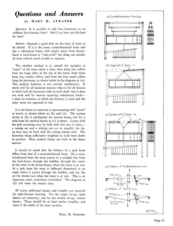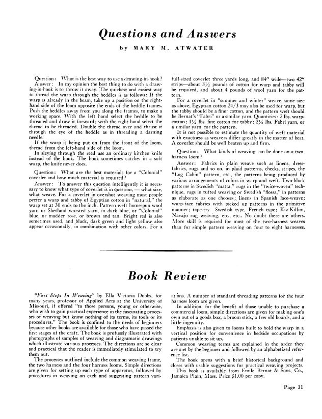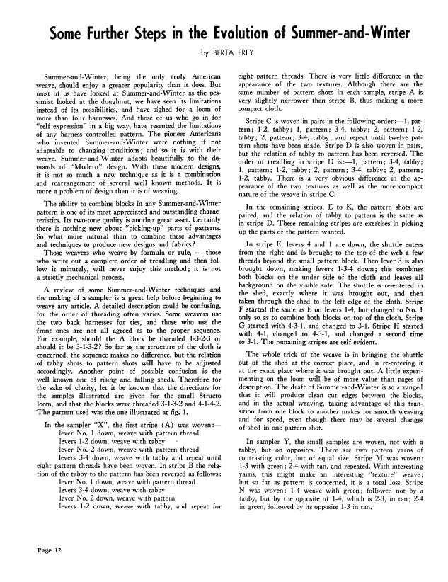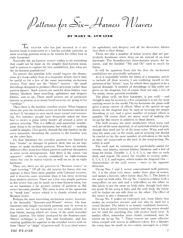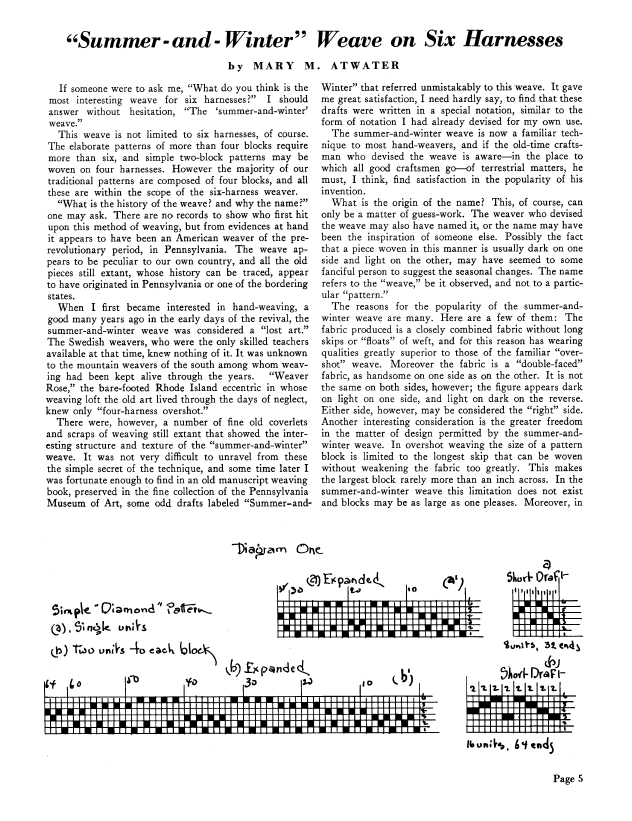 Summer and Winter Weave on a 6-Harness, Atwater, Mary M. Weaver, Vol. 3 No. 1 (January 1938), 4 pages. Note: PDF provided by Judith Combs. Posted September 2, 2006. SAMPLE PAGE. File size 418 KB PDF