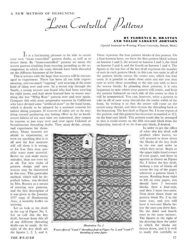Loom Controlled Patterns, Bratten, Florence D. and Nellie Sargent Johnson. Weaver, Vol. 2 No. 3 (July 1937), 6 pages. Note: PDF provided by Judith Combs. Posted September 2, 2006. SAMPLE PAGE. File size 632 KB PDF