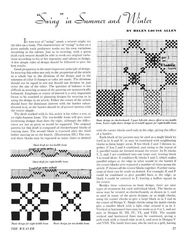 Swing in Summer and Winter, Allen, Helen Louise. Weaver, Vol. 2 No. 3 (July 1937), 5 pages. Note: PDF provided by Judith Combs. Posted September 2, 2006. SAMPLE PAGE. File size 573 KB PDF