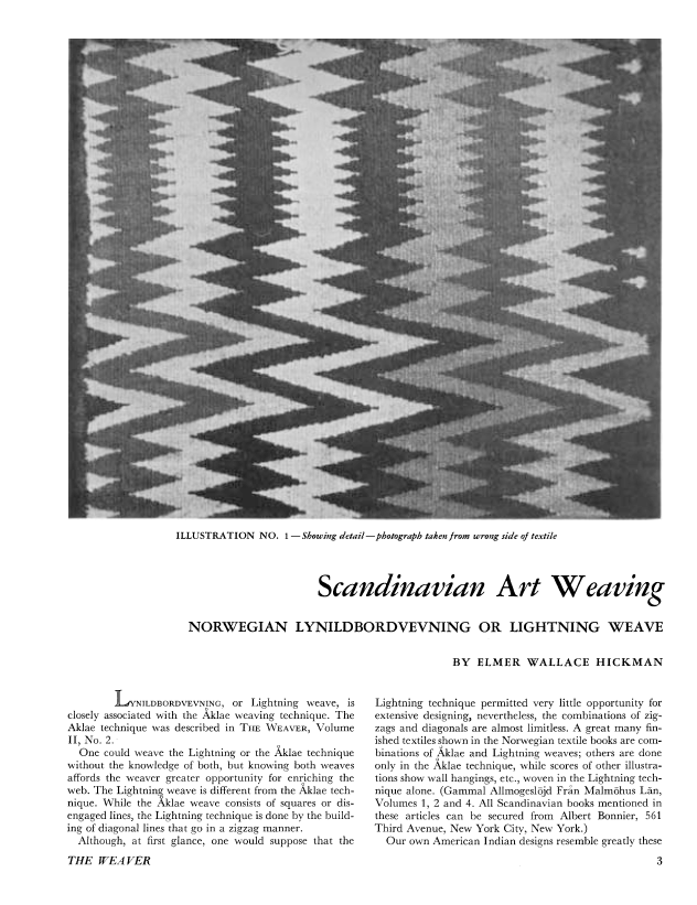 Scandinavian Art Weaving, Norwegian Lynildbordvevning or Lightning Weave, Hickman, Elmer Wallace. Weaver, Vol. 2 No. 4 (October 1937), 8 pages. Note: PDF provided by Judith Combs. Posted September 2, 2006. SAMPLE PAGE. File size 981 KB PDF