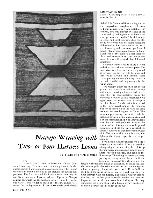 Navajo Weaving with Two- or Four-Harness Looms, Cole, Ellis Prentice. Weaver, Vol. 2 No. 4 (October 1937), 3 pages. Note: PDF provided by Judith Combs. Posted September 2, 2006. SAMPLE PAGE. File size 616 KB PDF