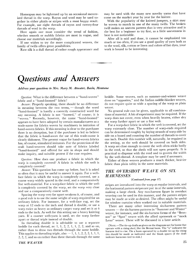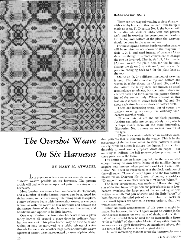The Overshot Weave On Six Harnesses, Atwater, Mary M. Weaver, Vol. 2 No. 4 (October 1937), 5 pages. Note: PDF provided by Judith Combs. Posted September 2, 2006. SAMPLE PAGE. File size 551 KB PDF