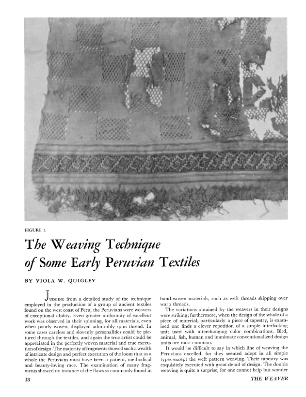 Weaving Technique of Some Early Peruvian Textiles, Quigley, Viola W. Weaver, Vol. 2 No. 4 (October 1937), 6 pages. Note: PDF provided by Judith Combs. Posted September 2, 2006. SAMPLE PAGE. File size 864 KB PDF