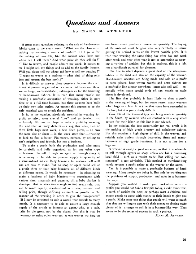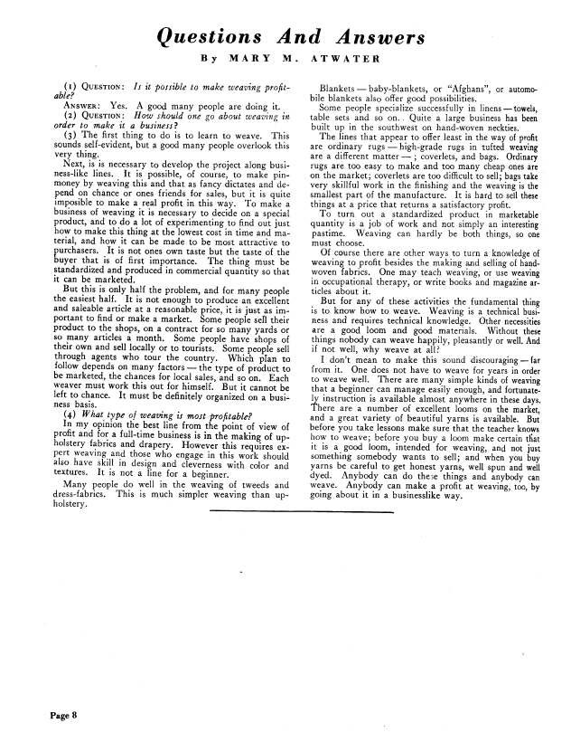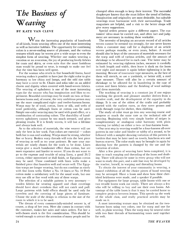 The Business of Weaving, Cleve, Kate Van. Weaver, Vol. 2 No. 4 (October 1937), 2 pages. Note: PDF provided by Judith Combs. Posted September 2, 2006. SAMPLE PAGE. File size 283 KB PDF
