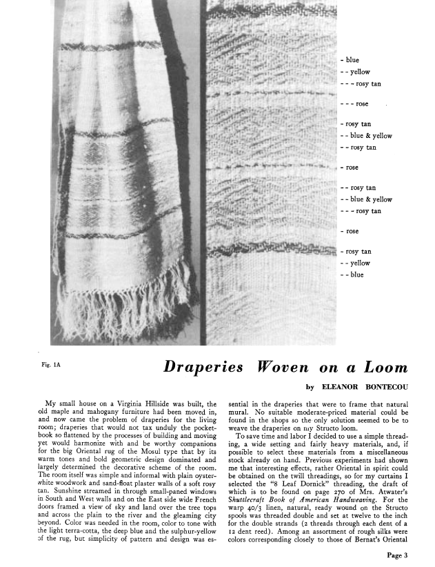 Draperies Woven on a Loom, Bontecou, Eleanor. Weaver, Vol. 3 No. 1 (January 1938), 2 pages. Note: PDF provided by Judith Combs. Posted September 2, 2006. SAMPLE PAGE. File size 204 KB PDF