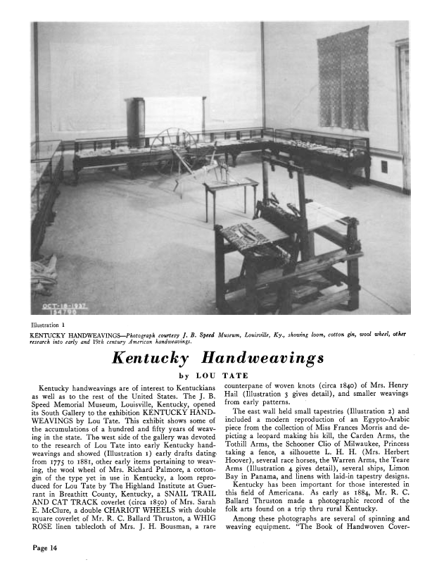 Kentucky Hand-Weavings, Tate, Lou. Weaver, Vol. 3 No. 1 (January 1938), 4 pages. Note: PDF provided by Judith Combs. Posted September 2, 2006. SAMPLE PAGE. File size 326 KB PDF