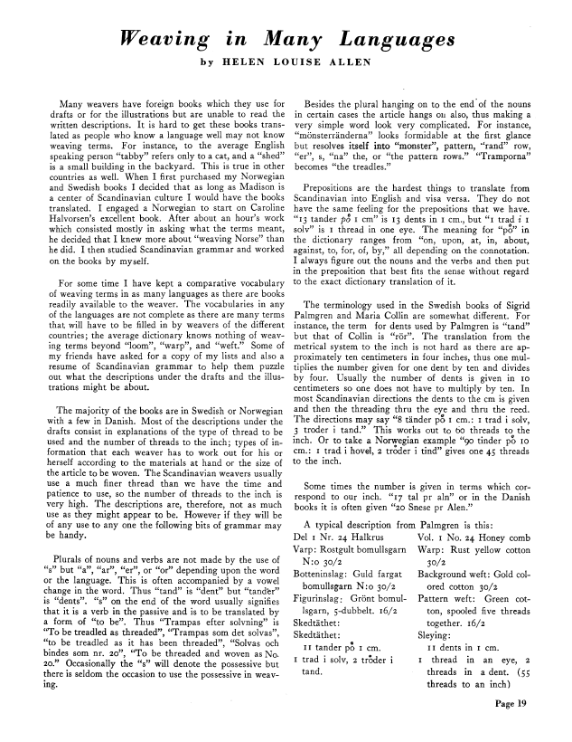 Weaving in Many Languages, Allen, Helen Louise. Weaver, Vol. 3 No. 1 (January 1938), 2 pages. Note: PDF provided by Judith Combs. Posted September 2, 2006. SAMPLE PAGE. File size 196 KB PDF