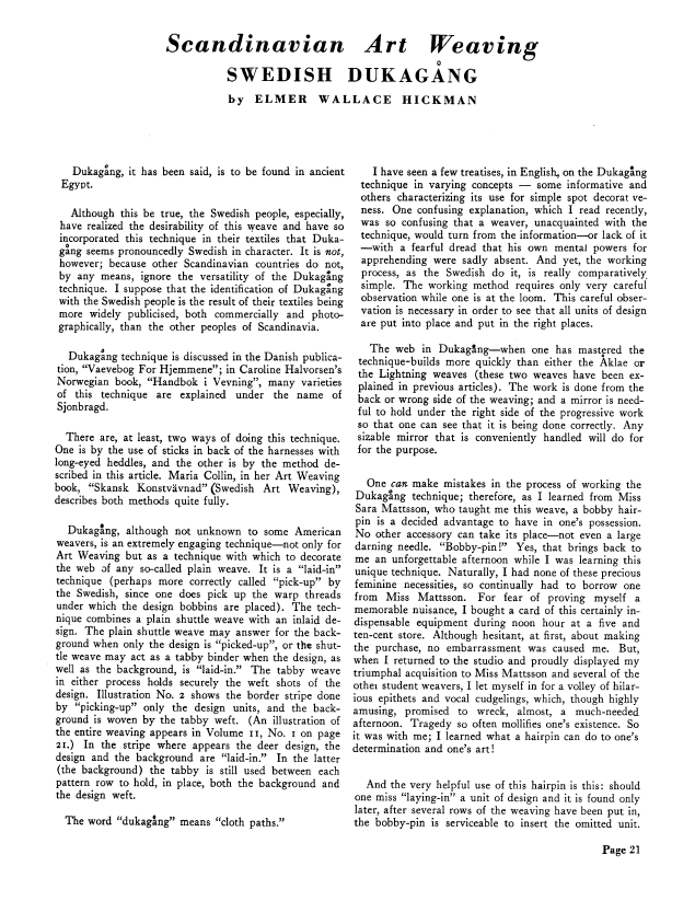 Scandinavian Art Weaving, Swedish Dukagang, Hickman, Elmer Wallace. Weaver, Vol. 3 No. 1 (January 1938), 9 pages. Note: PDF provided by Judith Combs. Posted September 2, 2006. SAMPLE PAGE. File size 1.1 MB PDF