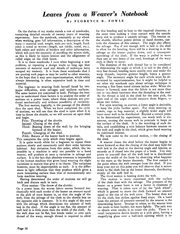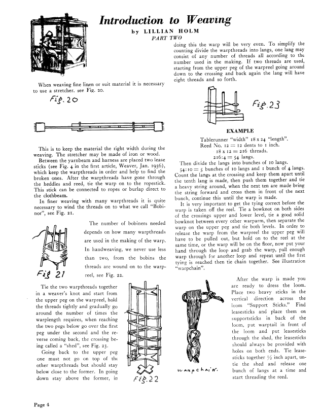 Introduction to Weaving, Part 2, Holm, Lillian. Weaver, Vol. 3 No. 2 (April 1938), 5 pages. Note: PDF provided by Judith Combs. Posted September 2, 2006. SAMPLE PAGE. File size 579 KB PDF